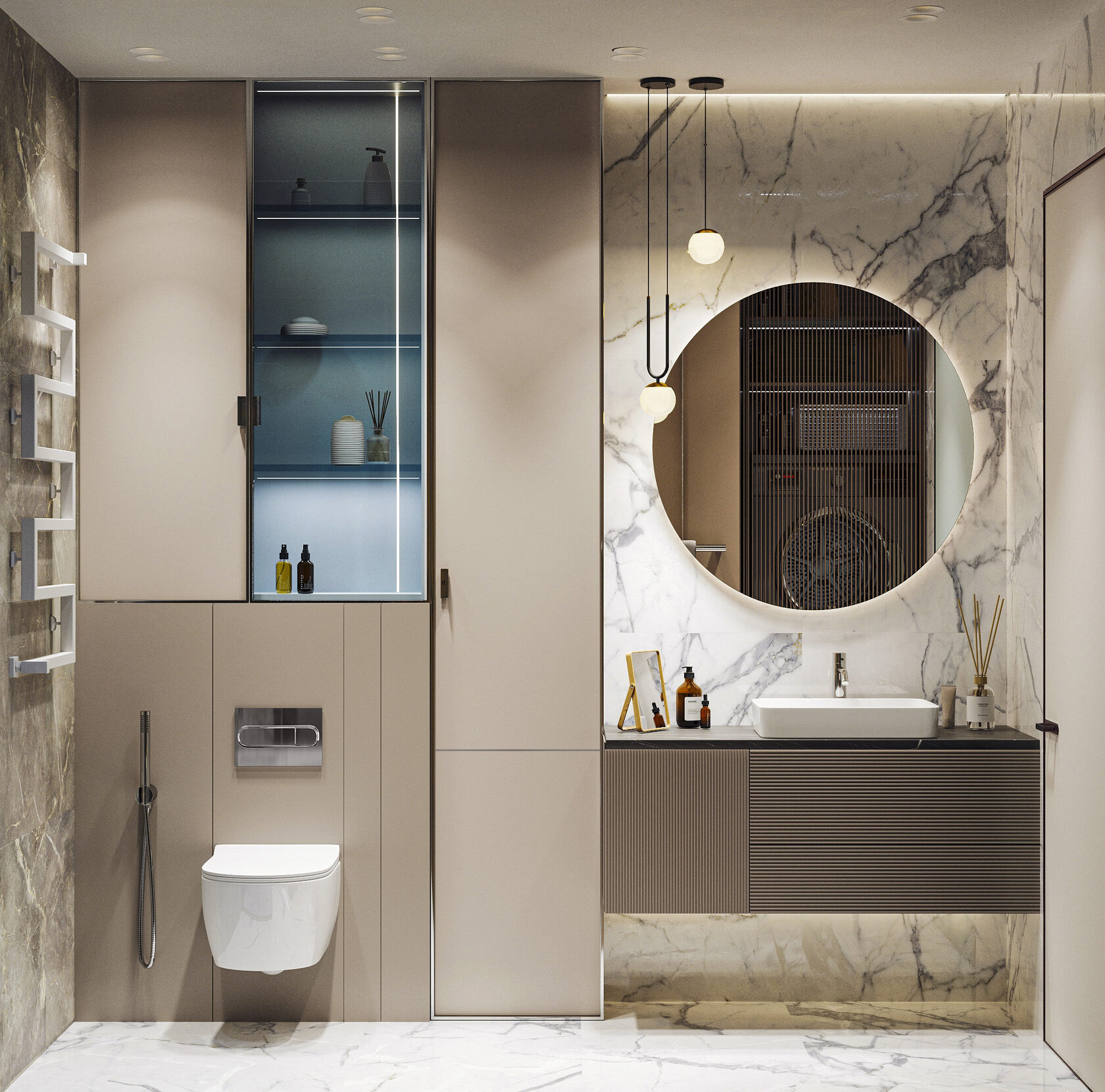 - Разноуровневое освещение. Комбинация основного, точечного и декоративного света создаёт настроение и подчёркивает архитектуру.