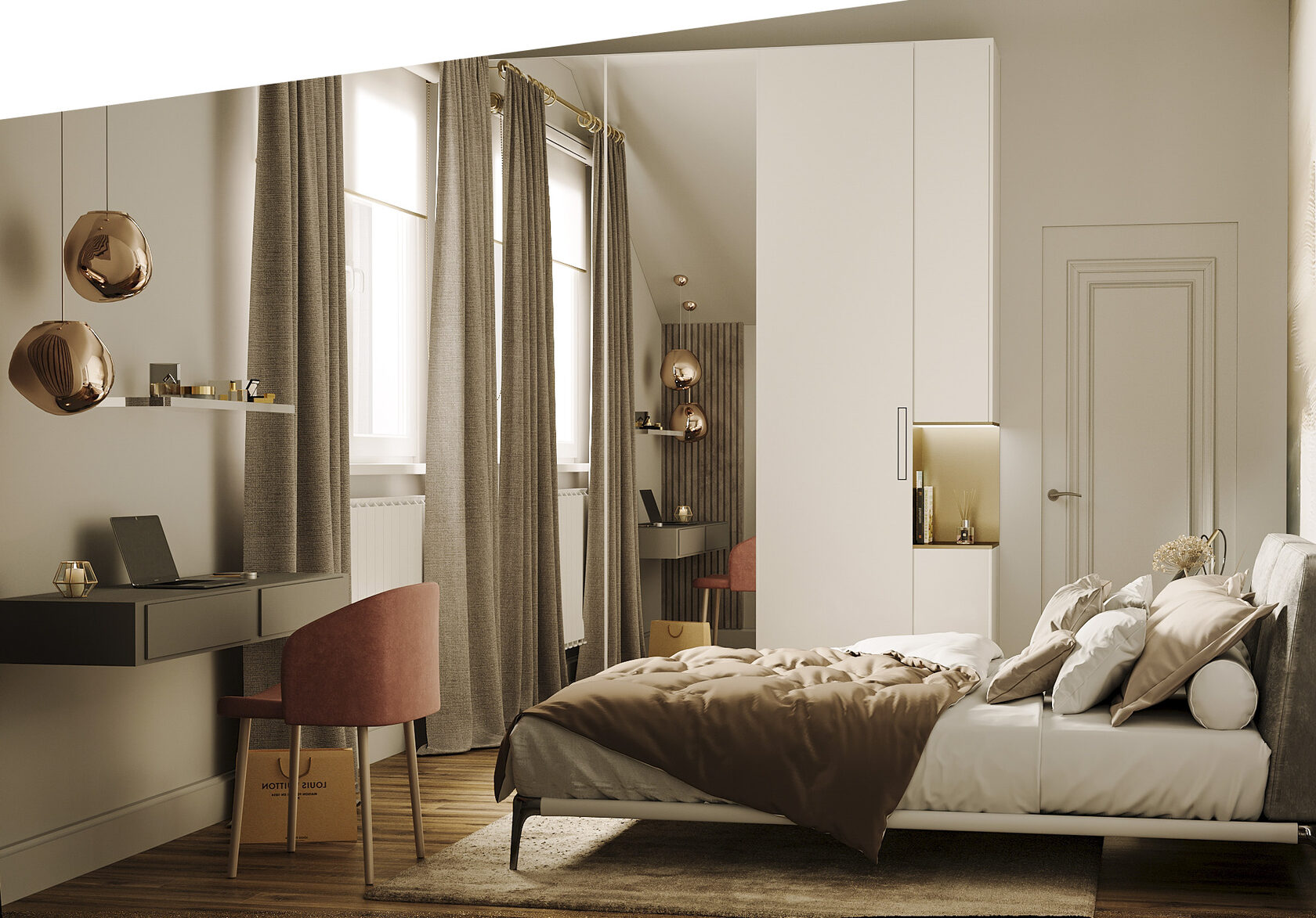 - В спальне актуальны плотные портьеры, которые блокируют свет и создают уединение.